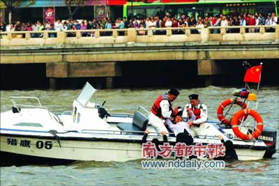 疑犯開著快艇一路狂逃,半路將人質(zhì)踹入水中;警方救人、擒賊、打撈物證,十幾分鐘內(nèi)全部完成。昨天,走過百余年歷史、默默守護(hù)珠江的廣州水警由幕后走向前臺(tái)!鞍倌晁,再創(chuàng)輝煌”2007年廣州警察開放日活動(dòng)在濱江西路水警碼頭和人民橋至解放大橋之間的珠江河面舉行。廣州水警向萬名圍觀市民演示了水上反劫持抓捕行動(dòng)。這是第六屆廣州“警察開放日”活動(dòng)的重頭戲。此外,水上表演還包含消防船表演、飛行表演等多個(gè)項(xiàng)目。