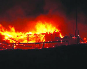 就在船主專心致志捕魚之際,突然他感到江面映出火苗的光亮。回頭一看,只見船艙里冒出一片火來,“不得了,怎么失火了?”船主大吃一驚,連忙丟下漁網(wǎng),拎起一桶水就潑過去,但杯水車薪,根本不管用,火勢越來越大,他將帶繩的桶扔到江里,想從江里打水上來撲火,但還沒等打上來第一桶水,剎那間,整個(gè)船艙就成了一片火海。由于火勢兇猛,他的頭發(fā)眉毛都被燒焦了?粗矍八袞|西都著火了,他意識(shí)到還是逃命要緊,被迫棄船,轉(zhuǎn)身向船頭跑去,對(duì)著江里的棧船就跳了過去。船主剛跳上棧船,就聽后面“轟”的一聲巨響,放在船艙里的那桶柴油也被燒著了。