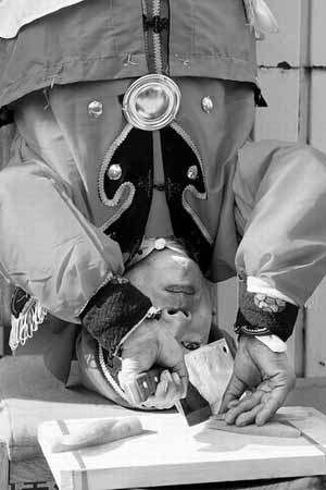 劉永全說,除了這些,他還能倒立打腰鼓。在助手的幫助下,劉永全左右膝蓋各綁上一個腰鼓,腰上一左一右系了兩個,然后又在脖子處固定了一個腰鼓。一切準備工作做好,劉永全“騰”地一下倒立起來,然后兩手上下翻飛,節(jié)奏感極強,鼓聲鏗鏘有力,從旁邊經(jīng)過的路人也被吸引了過來!皹浠钇,人活臉,出門前一定要化個妝!眲⒂廊f著,拿起放在旁邊的油彩小心地勾勒了起來,一會兒,勾勒出了一張活靈活現(xiàn)的猴臉。