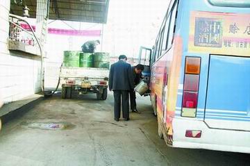 記者在現(xiàn)場(chǎng)看到,一輛2路公交車從該門(mén)市用油桶加過(guò)柴油后離開(kāi)。