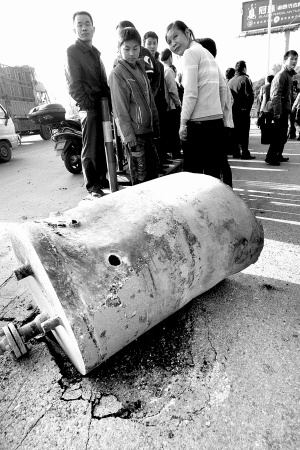 從楊高南路看進(jìn)去,加油站里面三座加油機(jī)尚且完好。而最靠浦三路的一臺平時為助動車加氣的加氣裝置已經(jīng)面目全非,底面積約四十平方米的地下貯氣罐被炸出地面。東側(cè)的楊高南路,西側(cè)的浦三路,包括更遠(yuǎn)處的昌里東路上,散落著大大小小的碎石,一個直徑半米左右的鐵罐,將楊高南路的非機(jī)動車道砸出了一個洞。