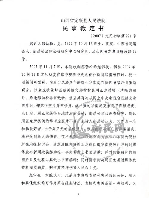 據(jù)媒體報道,郝勁松于11月7日正式向山西省定襄縣人民法院起訴“華南虎”拍攝者周正龍,按照民事訴訟法相關(guān)規(guī)定,在法定期限內(nèi),郝勁松沒有收到任何通知。11月28日,新民網(wǎng)連線郝勁松,他稱11月27日終于見到了定襄縣人民法院的民事裁定書,法院對郝勁松的起訴不予受理。郝勁松向新民網(wǎng)表示,他將在法定期限內(nèi)向山西省忻州市中級人民法院提出上訴。