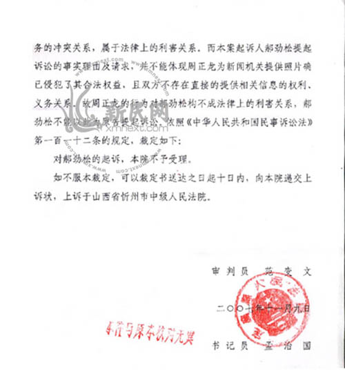 新民網(wǎng)從郝勁松提供的《山西省定襄縣人民法院民事裁定書》照片了解到,定襄法院不予受理的理由是:起訴人郝勁松提起訴訟的事實理由及請求,并不能體現(xiàn)周正龍為新聞機關(guān)提供照片確已侵犯了其合法權(quán)益,且雙方不存在直接的提供相關(guān)信息的權(quán)利、義務(wù)關(guān)系。故周正龍的行為對郝勁松構(gòu)不成法律上的利害關(guān)系,郝勁松不能以此為原告提起訴訟。