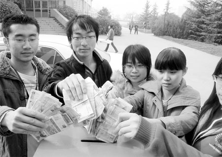 11月30日上午,西北工業(yè)大學(xué)明德學(xué)院的廣播里開始播放《陽(yáng)光報(bào)》和西安騰訊網(wǎng)關(guān)于孔靜救母的報(bào)道,去飯?zhí)贸燥埖膶W(xué)生走到募捐處排起長(zhǎng)隊(duì)捐錢,100元、50元、10元、2元,校友們紛紛將節(jié)省下來(lái)的錢投到募捐箱里,。一名大一女生抹著眼淚說(shuō):“一個(gè)剛畢業(yè)的大學(xué)生,遇到這種事情也太難了,每天少吃一個(gè)菜,也要為孔靜姐姐捐些錢!30日下午,馬老師等人帶著全校師生的捐款14183.4元,送到了交大一附院的病房,孔靜不住地擦眼淚。