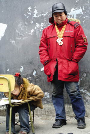 在覃紀(jì)虎的“賣場”,他把榮譽(yù)證書及相關(guān)報(bào)道的剪報(bào)擺了滿地,并打出賣獎?wù)碌恼信,女兒曉艷在一旁靜靜地伏在一把椅子上寫作業(yè)。不時(shí)有過往的行人前來觀看,然后為他們捐一點(diǎn)錢。