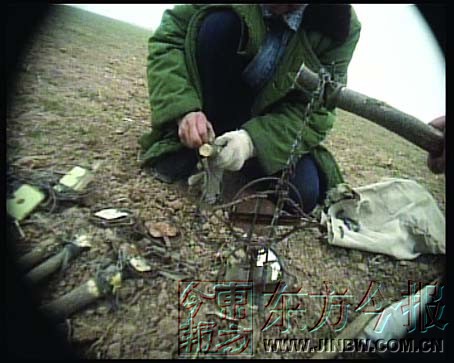 記者在遠(yuǎn)處觀察,只見兩人把大量的鐵夾置于沙土上,鐵夾上連著一條鐵鏈,鐵鏈上再綁一個木橛子,木橛子被深深地釘在地上。