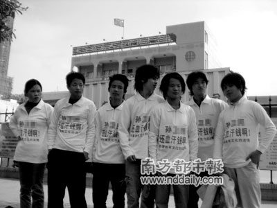 為了討到25萬元欠款,債主羅先生專門制作了8件專用“討債T恤”,讓8名男女員工各穿一件一字排開站在欠債方所在單位門前,并聲言“不拿到欠款決不收兵”。昨日上午,這一奇特的討債方式在長安鎮(zhèn)某學(xué)校門前上演。