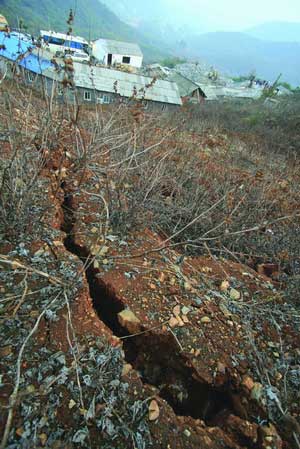 昨日下午,由于救援現(xiàn)場被三重封鎖,記者再次繞道爬上陽沖鐵礦的北面后山,在距離鐵礦礦井口約20米遠(yuǎn)處,一條長達(dá)十余米的裂縫驚現(xiàn)眼前,而裂縫所在的位置的下方,正是該礦的采礦區(qū)域。這條裂縫有近20厘米寬,形成一片面積約50平米的扇形塌陷區(qū),塌陷區(qū)內(nèi)還有多條細(xì)一點(diǎn)的裂縫。
