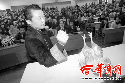 “貓最怕什么?”“老鼠”!這不是在玩腦筋急轉(zhuǎn)彎;一名懸空躺下的男子膝蓋上站著一位成年人,這也不是在練硬氣功;眾目睽睽下,通過(guò)“交流”,一只正在奮力掙扎的母雞很快安靜下來(lái),這更不是因?yàn)樗苈牰嗽挕_@是昨日在西安第四軍醫(yī)大學(xué)舉行的一場(chǎng)“自然催眠療法”公益演示會(huì)上,聽眾進(jìn)行的一次“催眠之旅”。