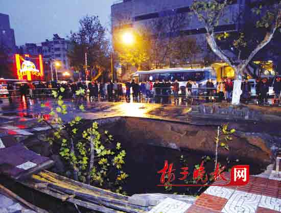 由于路面塌陷,暴露在坑口部位的煤氣管道和水管處于懸空狀態(tài),已經(jīng)“彎了腰”,為防管道扭曲引發(fā)斷裂,甚至再出現(xiàn)二次事故,地鐵施工方立即組織人員用鋼筋支撐管道。很快,一輛翻斗車運(yùn)來一斗沙包,幾十名工人將近百袋沙包填了進(jìn)去,但坑內(nèi)竟聽不到聲音,好像“無底洞”。為了安全,幾十名工人被緊急撤出現(xiàn)場。大坑南側(cè)兩米遠(yuǎn)的綠化島上有一棵成年大梧桐,記者設(shè)法接近洞口進(jìn)行拍照,于是來到那棵大樹下,料想靠著它是安全的。剛拍完一張照片后,兩名救援人員立即攆走記者。5點(diǎn)49分,“轟”的一聲響,現(xiàn)場跟著傳出一陣驚訝聲,記者原先依靠著拍照的那棵樹掉了下去,綠化島也塌陷了一段,驚得記者出了一身冷汗:乖乖,若剛才遲走片刻,后果難料!此時,現(xiàn)場的警察和保安嚴(yán)厲疏散圍觀人員,警戒線又隨著擴(kuò)大了一圈。6點(diǎn)11分,又是一聲轟響,大坑西側(cè)的一棵樹也塌陷進(jìn)坑,樹旁的一對垃圾桶也不見。此時,警戒線又大了一圈,記者很快從交管部門獲悉,漢中路東向西實(shí)行全封閉,公交車、私家車全部從周邊上海路、牌樓巷等處繞行,西向東只剩下兩股車道,何時恢復(fù)要看搶修進(jìn)度。