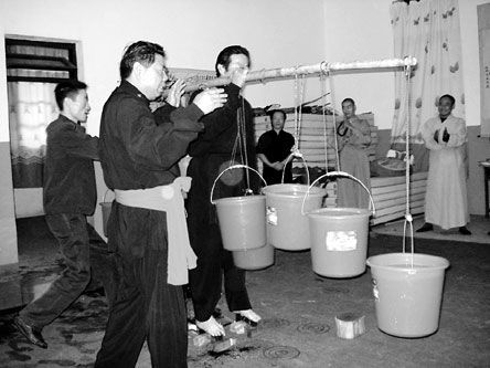 陳師傅說(shuō),除了踏刀提水外,他還有金剛腿、金槍刺喉等絕活!斑@些功夫源自少林。運(yùn)功后,身體的肌肉會(huì)變硬,可抵擋銳器。”他說(shuō),最先練踏刀提水時(shí),是嘗試性地站在刀刃上,當(dāng)時(shí)腳也會(huì)被割傷。隨著時(shí)間推移,腳皮越練越厚,在刀刃上堅(jiān)持的時(shí)間也越來(lái)越長(zhǎng)。