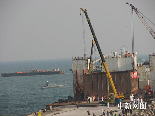 據(jù)介紹,今天適逢一個月內(nèi)潮位最高之日,本最有利于“南海一號”登陸。經(jīng)過今晚約兩個小時的努力,“南海一號”在甲板上被拖移了約十六米,但離碼頭尚有約八米。