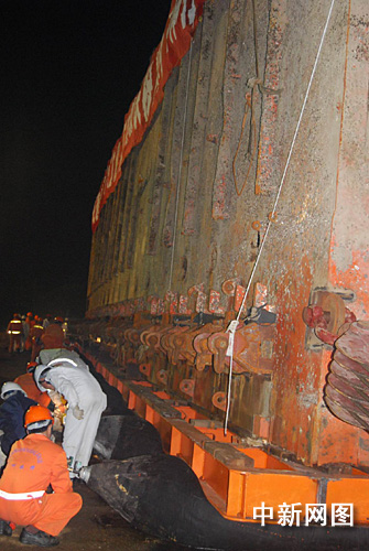 “南海一號”原本計劃今晚拖至岸上,并拉移至“水晶宮”中。在現(xiàn)場,記者看到,工作人員利用16個氣囊墊在“南海一號”下進(jìn)行拖移。每個氣囊直徑一米,能承受五百噸的壓力。在拖移過程中,工作人員必須不斷調(diào)整氣囊位置,但顯然難度不小。在工作進(jìn)行到十點(diǎn)半左右時,有關(guān)方面決定暫停拖移。