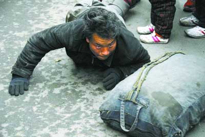昨日下午3時(shí)許,張先生反映,一“精神正!钡拿窆ぴ卩嵵菔袞|三馬路上爬行,且已爬行了幾百米。而蹊蹺的是,民工竟拒絕幫助,連路人給錢都不要。