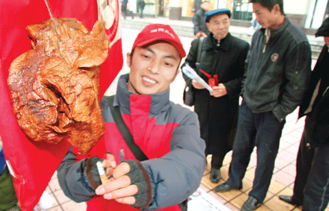 12月27日,長沙市黃興南路步行街,張好記舉著禁煙宣傳牌,不時用點燃的香煙去熏掛在宣傳牌上又干又黑的豬肺實習生龔磊攝本報12月27日訊“希望這個被熏黑的豬肺能給‘煙民’敲響警鐘,讓他們滅掉手中的香煙!苯裉焐衔,長沙市黃興南路,來自瀏陽的張好記舉著禁煙宣傳牌,不時用點燃的香煙去熏掛在宣傳牌上又干又黑的豬肺。