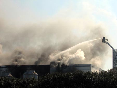 中午12點(diǎn)左右,中新社浙江分社記者趕到下沙6號(hào)大街,雖然離火災(zāi)現(xiàn)場(chǎng)還有近百米,但是已經(jīng)能夠看到十多米高的濃煙。著火的廠房是杭州怡得樂(lè)有限責(zé)任公司,位于杭州下沙開(kāi)發(fā)區(qū)8號(hào)大街,整個(gè)廠房彌漫在濃煙當(dāng)中,有7輛消防車(chē)停在臨近的5號(hào)大街,無(wú)法靠近施救。