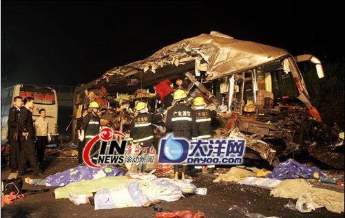 今天凌晨1點(diǎn)40分左右,渝湛高速洋青路段發(fā)生特大交通事故,一輛深圳開(kāi)往南寧(桂A18716)的臥鋪客車追尾撞上一輛新奧燃?xì)獾蜏匾后w運(yùn)輸半掛車后,沖過(guò)中間防護(hù)欄狂奔三十多米,迎面和另一輛貴陽(yáng)開(kāi)往珠海(粵C50821)的臥鋪客車相撞,當(dāng)場(chǎng)造成十人死亡七人重傷。目前事故原因正在進(jìn)一步調(diào)查中。