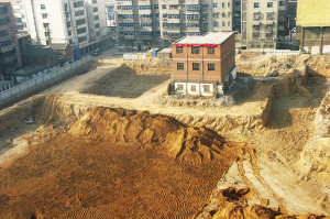 1月8日,河南省焦作市某舊城改造工地上矗立著孤零零的一棟樓。焦作市升恒房地產(chǎn)開發(fā)公司于2003年啟動舊城改造項目的開發(fā),由于一戶搬遷戶要求賠償數(shù)額同開發(fā)商不能達成一致,成為了堅持到底的“釘子戶”。幾年來,雙方始終未達成協(xié)議。耽誤不起工期的開發(fā)商先行對其他位置進行開發(fā),從而形成了如今的場景。宏航 攝