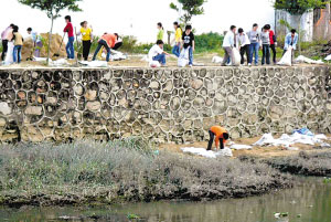 記者前天下午接報,趕到事發(fā)現(xiàn)場。在距離赤坎水廠不足5米的地方,就是沙地箱包制品廠有限公司(下簡稱沙地公司)。該公司在赤坎河邊開挖了一個暗渠作為排污口,排放的污染物呈淤黑色,并發(fā)出難聞的腥臭味。當時,沙地公司正組織人力把排污口封閉,并用吊車把河里淤黑的污染泥漿運走。