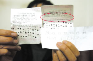 “因為不想讓彩票‘露氣’,我拿了彩票和自己手寫的號碼便條,急急裝到了口袋內(nèi)就走了。第二天,我看到報紙公布的中獎號碼,拿出手寫便條上的號碼一看,其中一個號碼就是500萬的中獎號碼,可拿出彩票卻發(fā)現(xiàn)竟然沒有號碼。我要為我這500萬元討個說法!弊蛉丈衔,張先生拿著他手寫的選碼和空白彩票,來到本報投訴。