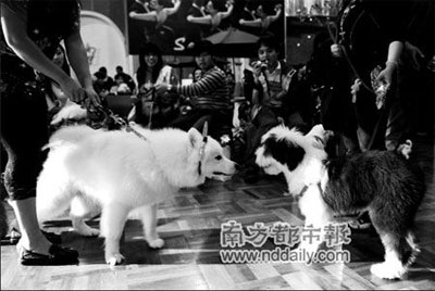 現(xiàn)場(chǎng)一下子要請(qǐng)來幾十名狗狗,真不容易。狗主們各顯神通,有的拿包包當(dāng)工具,有的直接抱進(jìn)來的,訓(xùn)練有素的狗狗則直接跟在主人后面閃亮登場(chǎng)了。它們?cè)诂F(xiàn)場(chǎng)看到這么多同類,都好奇地互相打量,小心翼翼地上前用鼻子嗅嗅,算是問個(gè)安了。