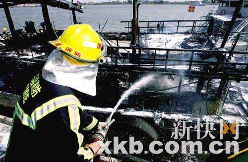 一名消防員指著船尾兩個(gè)被埋在木炭堆中的煤氣瓶說(shuō):“據(jù)船員說(shuō),船上本來(lái)有3個(gè)煤氣瓶,其中兩個(gè)剛加滿(mǎn)氣,另一個(gè)是空的,起火后有一個(gè)爆炸了。一名船員當(dāng)時(shí)在船頭位置,發(fā)現(xiàn)起火后就把纜繩解開(kāi)了。后來(lái)他發(fā)現(xiàn)自己的手機(jī)放在駕駛艙,就闖進(jìn)去想拿出來(lái)報(bào)警,沒(méi)想到手機(jī)被燒壞了!