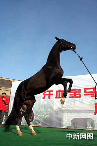 此次展出的“汗血寶馬”名叫阿利姆,是一匹“四蹄踏雪”而全身黑色的5歲公馬,身高162厘米,毛色光亮,腰身緊湊,肌肉線條優(yōu)美,堪稱良駒中的“小帥哥”。當(dāng)它前蹄抬起,后蹄直立向觀眾問好時,其奔放的姿態(tài)贏來陣陣叫好聲,記者身旁的小朋友也樂得拍起巴掌。