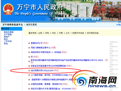 記者打開萬寧市人民政府網(wǎng)站時,在首頁上點擊進(jìn)入萬寧信息供應(yīng)平臺,在該平臺上的“南藥瓜果”欄目的第六條信息中,記者發(fā)現(xiàn)“迷幻藥蒙汗藥13082***905[供應(yīng)]”的信息。點擊進(jìn)入時,里面的內(nèi)容非常詳細(xì)。不但介紹了香港GHB粉、香煙型迷藥、噴霧型迷藥等各類迷幻藥蒙汗藥的成分、價錢、服用方法,還標(biāo)明了服用后的反應(yīng)。該信息還稱,“誠信交易,貨真價實,無效退款。!嚴(yán)禁一切詐騙分子復(fù)制本公司廣告。!本公司本著信譽第一,效果保證,誠信經(jīng)營的原則,真誠與全國各地朋友長期合作,真正需要貨的朋友,請注意,提防騙子用低廉價格寄假貨,來騙取你們急需等著用貨的人,請不要貪小便宜而上當(dāng),效果那么好,能賣你兩三百元,四五百元嗎?我們的藥雖然比別人貴了點,但效果絕對保證達(dá)到我們廣告所說那種效果,貨到你們當(dāng)?shù)啬阍囈幌,你就知道我們的藥效和信譽。本公司奉勸那些網(wǎng)絡(luò)騙子。不要再騙那些真的需要藥的朋友了,都是在外面混的人。少做點讓人罵的事。也勸沒有貨的商家,我這里有大量的貨可以批發(fā)給你們,你找不到進(jìn)貨渠道?梢栽谖疫@里拿,你要的量大。我們可以談。批發(fā)的價錢可以給你去賣,并且比你騙別人的那點錢,賺得多,誠信經(jīng)營生意越做越大,欺詐客戶生意越做越小。歡迎來電洽談合作!