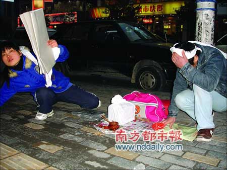 記者趕到時(shí),只見一男一女跪在地上,他們頭上系著白布,旁邊點(diǎn)著蠟燭,放著骨灰盒,燒著紙錢。圍觀的市民被這一場(chǎng)景感動(dòng),紛紛慷慨解囊。記者詢問時(shí),女子一直支支吾吾并抽泣。記者拍照時(shí),女子用石塊砸向記者。男子對(duì)記者說:“這本來(lái)就是騙錢!” (記者 馬小六)