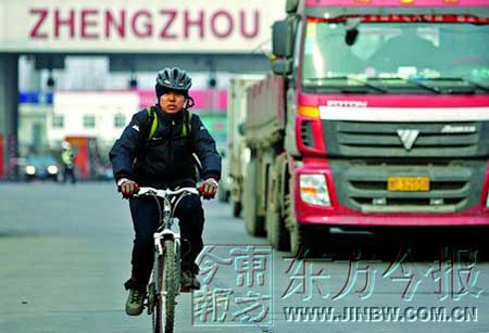 昨日中午12時20分,鄭州北郊黃河大橋收費站,當一個戴著頭盔身背大包的小伙子騎著自行車駛出收費站時,早已在此等候的親朋好友發(fā)出一陣歡呼:高富松是全程騎著自行車從北京返回鄭州的,這么惡劣的天氣,這個從未受過相關(guān)訓(xùn)練的年輕人用了一周才走完。