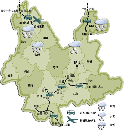 昨天下午6點,云南省氣象臺發(fā)出了大雪結冰預警,預計從30日晚上8點至31日上午8點,由于冷空氣向南擴散,滇西北地區(qū)仍有中到大雪,局部地區(qū)暴雪;滇中以東地區(qū)有小雪和冰凍天氣。據(jù)氣象臺觀測到的數(shù)據(jù)顯示:昨天上午開始,停留在昭通和迪慶的冷空氣突然向南移動,天氣剛剛有所好轉的昭通又開始飄雪,曲靖的宣威、沾益、會澤一帶氣溫急劇降低10度左右,昨天下午氣溫降到零下3度,今天部分地區(qū)可能出現(xiàn)短時雨雪;滇西北的迪慶香格里拉昨天依舊大雪紛飛,這一區(qū)域的冷空氣也開始向大理、麗江蔓延,昨天,大理的洱源縣也下起了雨雪。