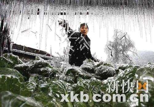 ■昨日上午,乳源縣洛陽鎮(zhèn)鐘屋村村民鐘電強在自家菜園子里清除冰棱,長時間冰凍將蔬菜凍死大半。