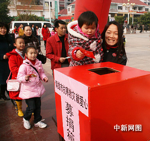 南雄市借助春節(jié)人們團聚的機會,利用電視、公益告示、宣傳車等各種宣傳渠道,廣泛發(fā)動社會各界力量,開展“我與災民心連心”募捐活動,以各種形式為災區(qū)送溫暖獻愛心。