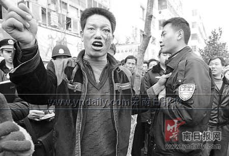 據(jù)李賢堂說(shuō),其家兄弟4人來(lái)昆明已有多年。二哥李賢友以前受過(guò)傷,醫(yī)治好后便身帶殘疾,與二嫂在昆明做米線(xiàn)生意。上午10點(diǎn)左右,他知道二哥送餌塊途經(jīng)人民東路時(shí)被城管打了,就迅速跑了來(lái)!翱吹蕉缣稍诘厣,餌塊散落一地,我就跑到一輛白色面包車(chē)前,攔住去路,沒(méi)想到,七八個(gè)男子就過(guò)來(lái)打我,他們那么多人,我咋個(gè)還手,打得我頭昏眼花,我只好抓住先打我的那個(gè)不放手!