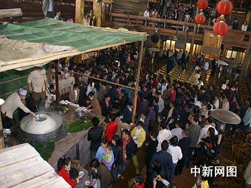 “吃湯圓,賣湯圓,一碗湯圓三毛錢!痹趧(dòng)聽的歌謠聲中,游客臉上都帶著興奮的笑容,按順序排隊(duì)等候工作人員的分吃湯圓。記者粗略的估計(jì)了一下,10余工作人員耗時(shí)一個(gè)多小時(shí)才把大湯圓分完。