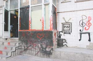 按照市民所說(shuō)的地址,記者找到了位于惠民路附近的這間“恐怖屋”,它位于一樓,為臨街的門市房,樓的外墻皮上還貼著一些瓷磚,這是以前搭在樓邊的“三小”被扒之后留下的,“三小”被扒后,貼在樓墻皮上的瓷磚未被摳下,外墻瓷磚上噴畫著一些類似電視、音符的圖案,還寫著英文“LES”。記者看到,門邊還寫著“男士禁入”幾個(gè)字,門玻璃上貼著黑紙,房間靠北邊的窗戶開著,但里面掛著窗簾,房間南窗戶下邊的墻壁上寫著“請(qǐng)勿偷看”,這幾個(gè)字的底色是紅色,外面又噴了一層黑色,看上去確實(shí)挺恐怖的。
