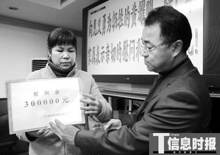 默哀、掌聲獻給見義勇為犧牲勇士;榮譽證書、獎勵存折送給勇士牽掛的家人。廣州去年10月起正式提高對市民見義勇為傷殘犧牲獎勵慰問金額度,昨日,最高獎勵30萬元首次各頒發(fā)給兩名犧牲者。家屬們代收榮譽證書和首次以存折形式發(fā)放的獎勵金,都表示倍感安慰。
