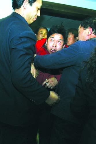 站在門外的十幾個(gè)民工看到保安動(dòng)手推搡記者,就闖了進(jìn)來。一穿紅色夾克的民工兩手作揖,幾次跪到地上,說“要打你們打我吧,不要打人家記者”。