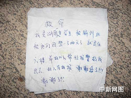 這天下午,一位熱心的中年婦女把發(fā)現(xiàn)字條的情況告訴了正在此地巡邏的民警,并把民警帶到樓下。民警見(jiàn)字條上面寫著“救命,我是湖南一女學(xué)生,被騙到此被他們囚禁了兩天了,就在六樓,希望好心人幫忙報(bào)警救我出去,好人有好報(bào)、謝謝您了。!”。
