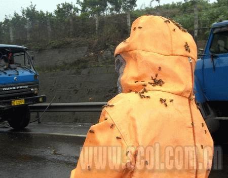昨日上午,一輛攀枝花車牌的5噸加長(zhǎng)大貨車,滿載150余箱(每箱5公斤約2萬余只)蜜蜂,途經(jīng)成渝高速146.5公里處時(shí),后右輪突然飛出車身,貨車側(cè)翻于公路上。車上脫箱而出的上百萬只蜜蜂,瞬時(shí)將成渝高速上空變成蜜蜂的海洋。事發(fā)后,交警、高交執(zhí)法隊(duì),以及資中消防官兵10余人聯(lián)手奮戰(zhàn)5個(gè)多小時(shí),中午1時(shí)30分,成渝高速得以恢復(fù)暢通。