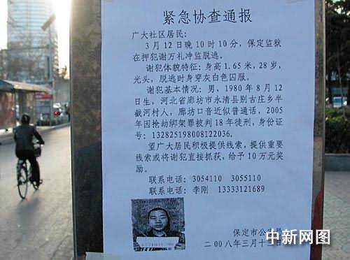 據(jù)悉,事件發(fā)生后,保定監(jiān)獄及當(dāng)?shù)毓、武警等部門出動大批警力在周邊各個主要路口設(shè)卡布控,同時在市區(qū)街道、小區(qū)醒目位置張貼通告,全力通緝追捕越獄逃犯。(完)