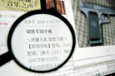 16日下午,海南一男子在重慶某網(wǎng)站發(fā)帖子,稱可以銷售各種型號的軍用手槍和全自動(dòng)狙擊步槍。重慶市公安局網(wǎng)監(jiān)管理處工作人員稱,已經(jīng)對此事備案,正在查處,提醒市民不要上當(dāng)。