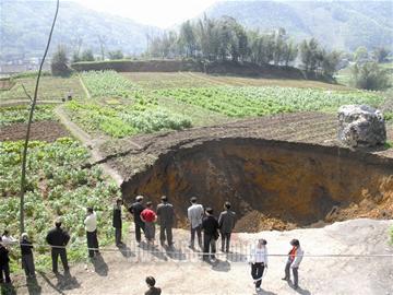 2008年3月25日凌晨,宜賓江安縣紅橋鎮(zhèn)五閣村發(fā)生了局部地面塌陷,形成大小不等的3個巨型“天坑”,呈直線展開,長約400米。塌陷嚴(yán)重威脅到附近的11家住戶57人。險情發(fā)生后,江安縣委、縣政府及當(dāng)?shù)丶t橋鎮(zhèn)政府立即緊急疏散塌陷影響區(qū)域內(nèi)的居民,并對“天坑”實施24小時的臨時警戒,防止意外事故發(fā)生。截至昨日,國土資源部門的地質(zhì)專家現(xiàn)場查勘得出的初步結(jié)論是:該地面塌陷是因為地下溶洞引發(fā)的小型巖溶塌陷,是自然形成的地質(zhì)災(zāi)害;進(jìn)一步的結(jié)論及處置措施待觀察3—5天后再定。