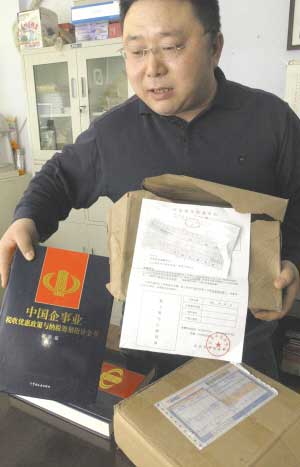昨日上午,在豐樂五金機電城東南一消防器材店,商戶胡先生拿出兩本天價書,滿臉愁苦。這兩本書的書名為《中國企事業(yè)稅收優(yōu)惠政策與納稅籌劃指導全書》。