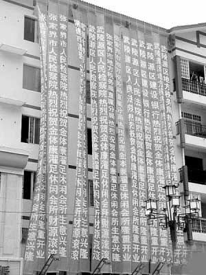 昨天,在不少門戶網(wǎng)站的論壇上出現(xiàn)了一篇名為《洗腳城開張的驚人場面 為何這么多公檢法機(jī)關(guān)捧場》的帖子。帖子一開始就提出了一個(gè)質(zhì)疑:一個(gè)洗腳城開張為何有這么多公檢法機(jī)關(guān)捧場?網(wǎng)友拍攝的圖片顯示:在張家界武陵源區(qū),一棟建筑物外懸掛著二十多個(gè)紅底白字的條幅,分別為“××熱烈祝賀金體康濯足休閑會所開業(yè)大吉”、“××熱烈祝賀金體康濯足休閑會所生意興隆”。最讓人驚訝的是,這些祝賀單位,不少竟然是當(dāng)?shù)氐恼畽C(jī)關(guān),包括人民法院、人民檢察院、稅務(wù)局、房管局等,涉及到的政府部門多達(dá)10余個(gè)。