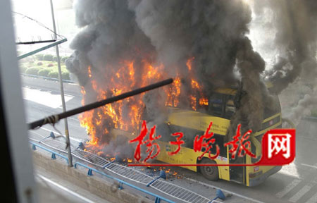 昨天上午7時(shí)55分,一輛雙層100路公交車在南京市雨花西路高架橋沿線尾部發(fā)生自燃,濃煙升騰數(shù)十米。時(shí)值上班高峰,公交車內(nèi)有乘客60多位。一騎車上班的市民發(fā)現(xiàn)火情后,奮追100多米,向駕駛員通報(bào)火情,隨即司機(jī)停車并及時(shí)疏導(dǎo)乘客,后因火勢太大,公交車瞬間成了“火”車,還危及地鐵中華門站10多米高正在運(yùn)行的地鐵線。隨即,消防官兵趕到現(xiàn)場,撲救大火。整個(gè)過程中,沒有乘客受傷。但是大火將公交車燒成了一個(gè)空殼,烤化了附近的店家門面招牌,熏黑了地鐵柵欄,道路旁的植物也被烤死。