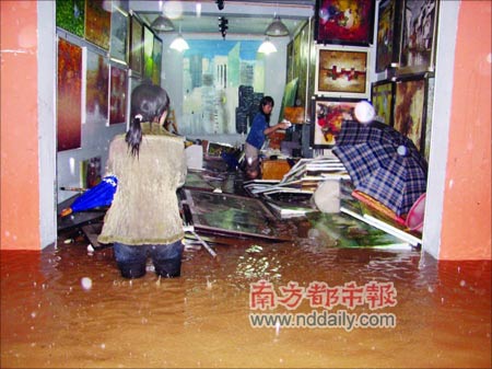 “水深的時(shí)候,洪水已經(jīng)淹到我胸口了!贝蠓矣彤嫶逡簧砀呓1米8左右的畫匠宿先生紅著雙眼告訴記者,19日晚8時(shí)左右他接到了油畫村相關(guān)管理部門的電話,可因?yàn)榭耧L(fēng)暴雨,路面大塞車,車開到布吉鎮(zhèn)政府時(shí),他舍車小跑到畫廊,趟著齊胸高的洪水趕到了畫廊!八尴壬f,他看到所有的水彩畫都泡在水里。