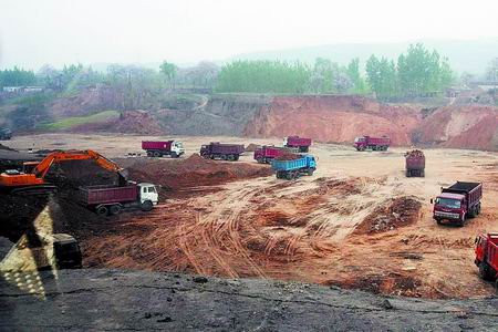 4月18日,記者來到現(xiàn)場(chǎng),在西施煤業(yè)公司東南角約100米處,記者看到,一個(gè)長(zhǎng)寬上百米,深20米的巨大露天采坑內(nèi),數(shù)臺(tái)大型挖掘機(jī)和十幾輛大卡車正在緊張忙碌地作業(yè)(如圖)。采坑?xùn)|部的挖掘機(jī)揮舞手臂,將從坑壁挖下來的土裝進(jìn)卡車,隨即這些土便被運(yùn)往采坑西側(cè)進(jìn)行填埋。在采坑的東南角及西側(cè)邊緣,麥苗裸露在新鮮的泥土外,尚未被挖掘的地表已經(jīng)出現(xiàn)裂紋,綠油油的麥苗生長(zhǎng)在夾縫中,岌岌可危。而西南側(cè)的深坑中,黑糊糊的煤層清晰可見。據(jù)當(dāng)?shù)匾幻槿罕娭v,這個(gè)露天煤礦已經(jīng)開采了有兩年時(shí)間,把麥田和樹木都?xì)Я,群眾有意見,煤礦就賠點(diǎn)錢。雖然是有群眾向登封市國(guó)土資源部門投訴,但一直沒有被查處!白罱犝f國(guó)土資源局來查了,才停止了露天挖煤!