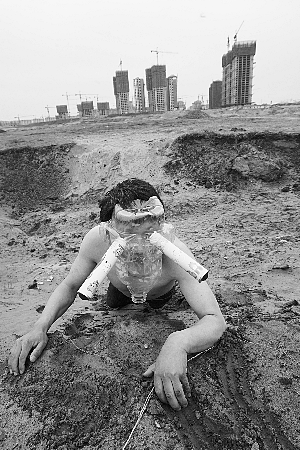 “這就是垃圾場,我們生活的地球已經(jīng)被垃圾覆蓋,我們安睡的地點(diǎn)就在垃圾的包圍之中!痹诰嚯x宋莊鎮(zhèn)1公里遠(yuǎn)的一片空曠地,堆滿了各種垃圾廢料,在蚊蠅的環(huán)繞下,藝術(shù)家們抬來一張床,一名男子躺在床上,全身被白布包裹,上衣被人剪開后,一只鬧鐘被捆綁在左胸前,隨著鬧鐘秒針的跳動,生活在垃圾包圍中的他,生命也向“死亡”逐步靠近。