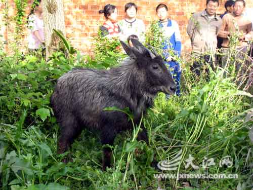 無獨(dú)有偶,昨日下午3時,距都昌縣中館鎮(zhèn)幾公里的鄱陽縣銀寶湖鄉(xiāng)銀寶村農(nóng)民馮奇,在自家門前的菜園內(nèi)發(fā)現(xiàn)一只“野山羊”在偷吃菜葉。只見這家伙身高1.2米左右,體重約100公斤?吹接腥藝^,“野山羊”飛快逃竄,村民們四處堵截,3個小時后才將它在一條胡同內(nèi)制服。鄱陽縣林業(yè)局的野保專家趕到現(xiàn)場告訴村民,這只“四不像”學(xué)名叫蘇門羚。